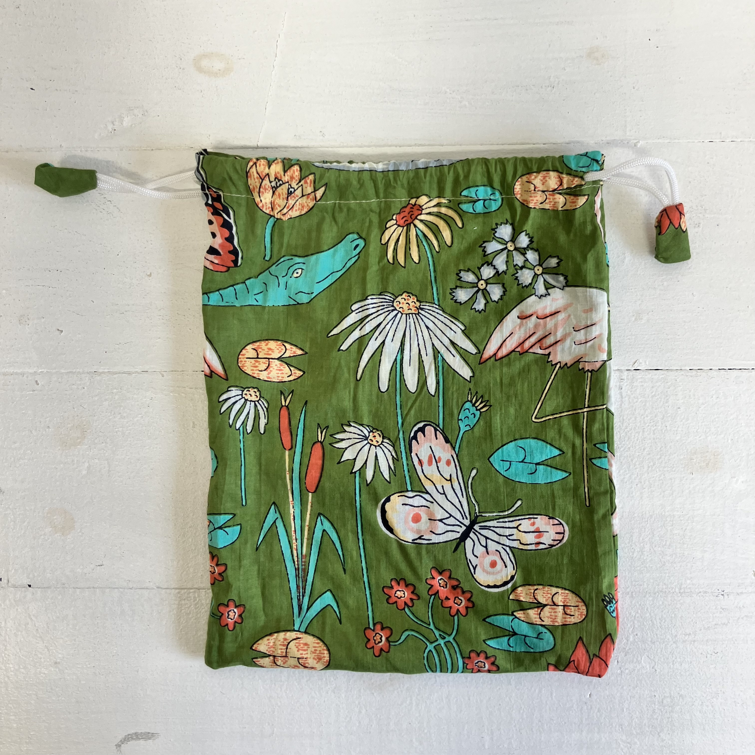 Kimono style cotton jacket with drawstring bag.