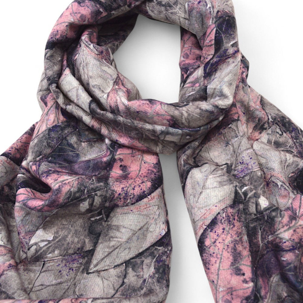Vibrant cashmere feel leaf printed design with tassels on the ends