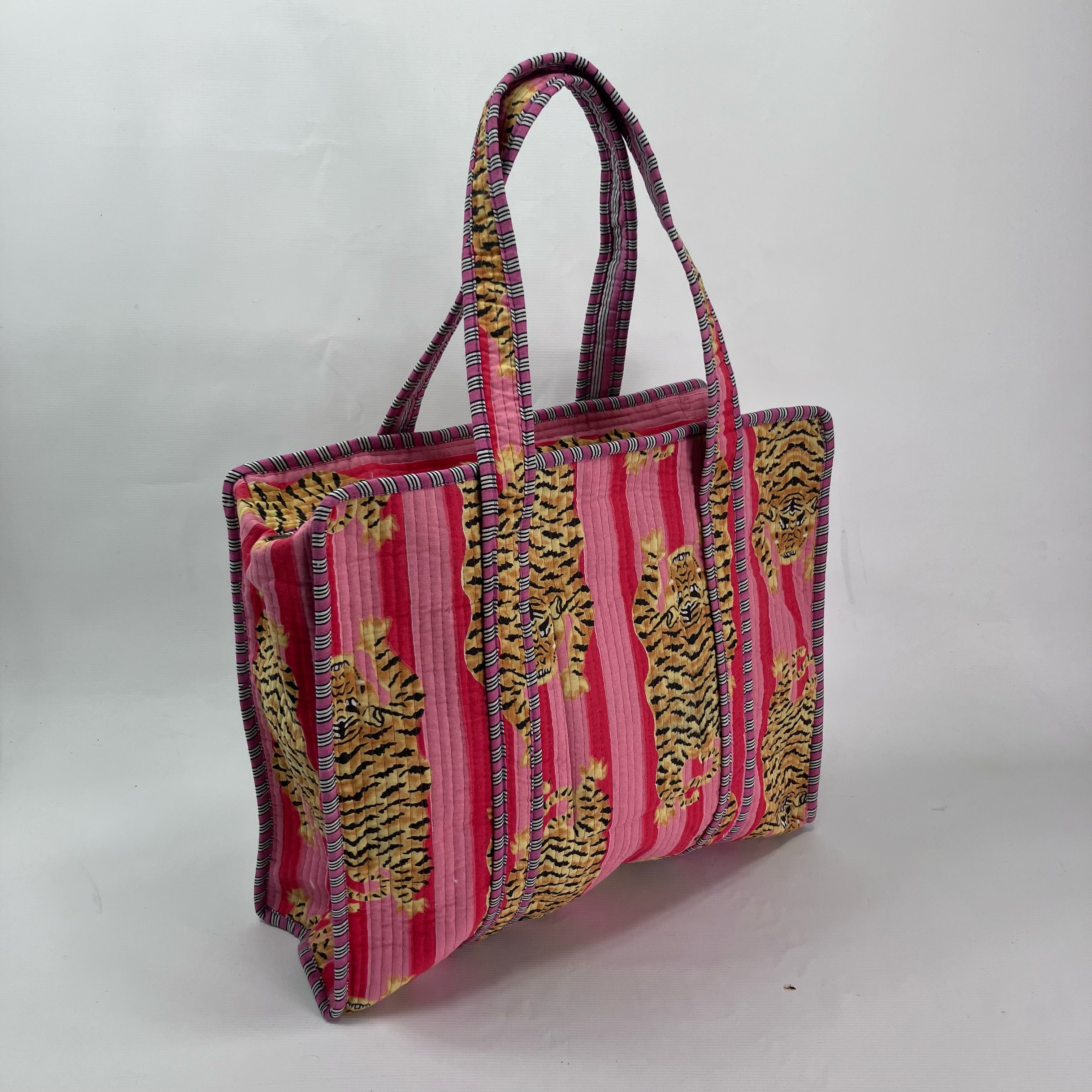 Featuring a vibrant tiger print in pink and red tones with contrast striped handles, this lightweight bag is ideal for retail customers looking for statement accessories with function.