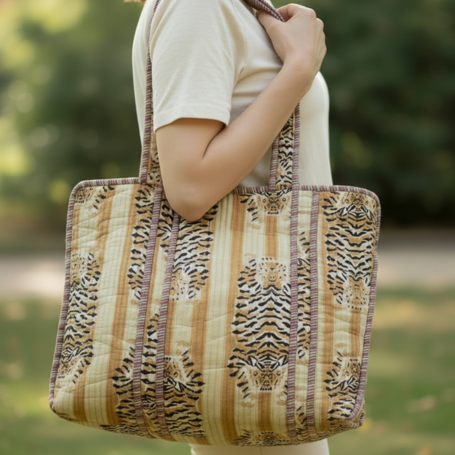Made from 100% cotton with padded quilting, the tote offers a soft but structured feel and a spacious interior ideal for daily essentials, shopping, travel, or beach use.