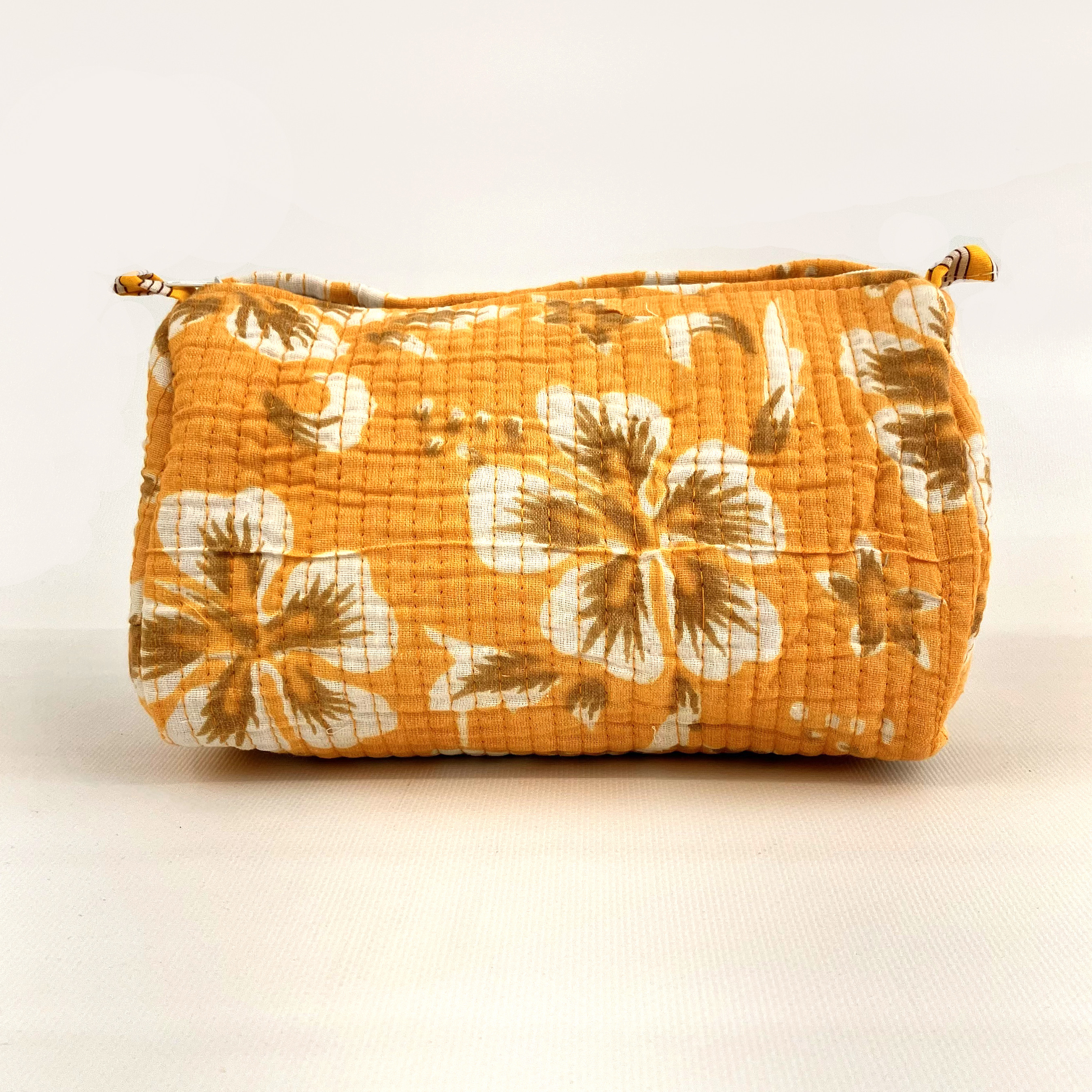 Quilted cotton wash bag, featuring a bold block print, artisan-inspired print.