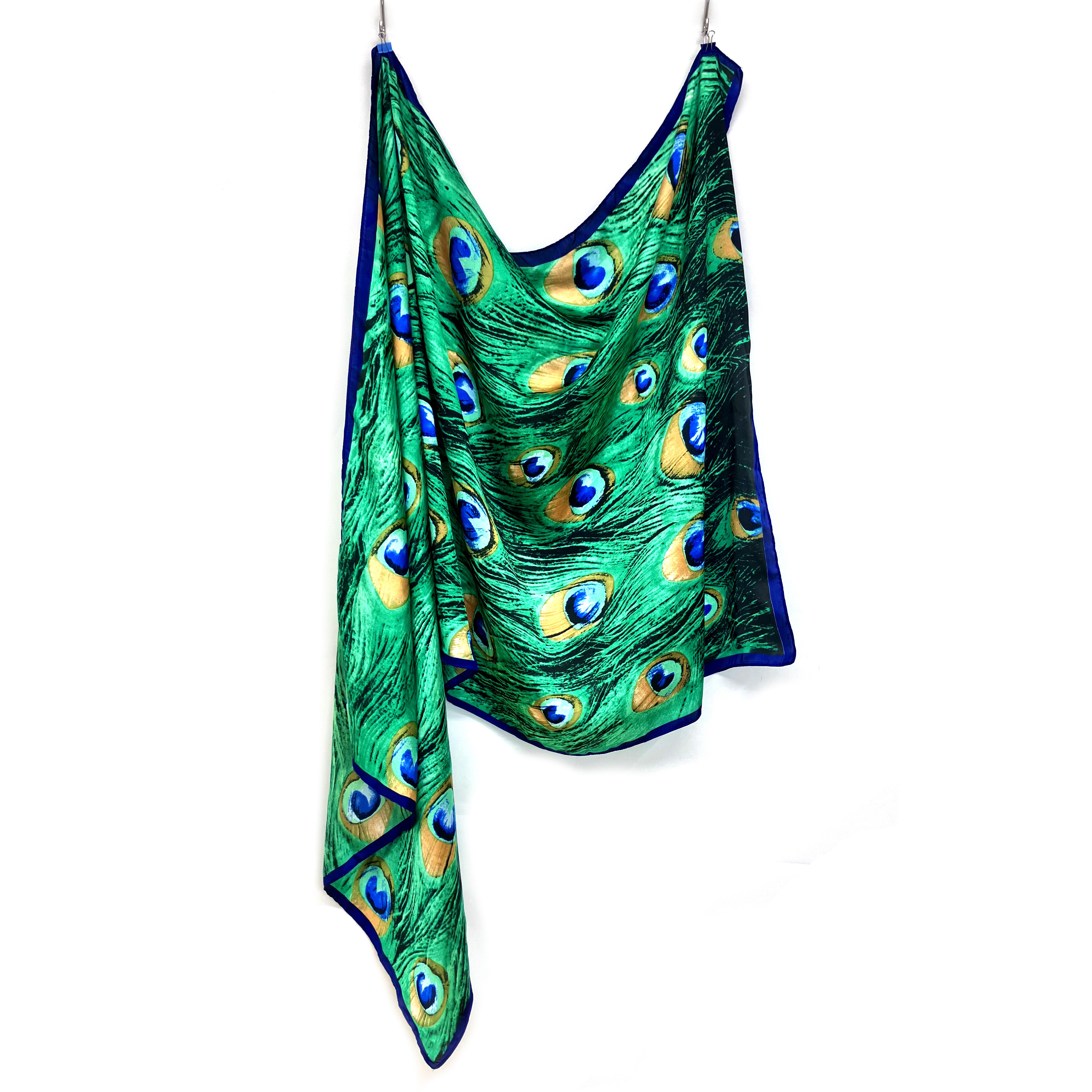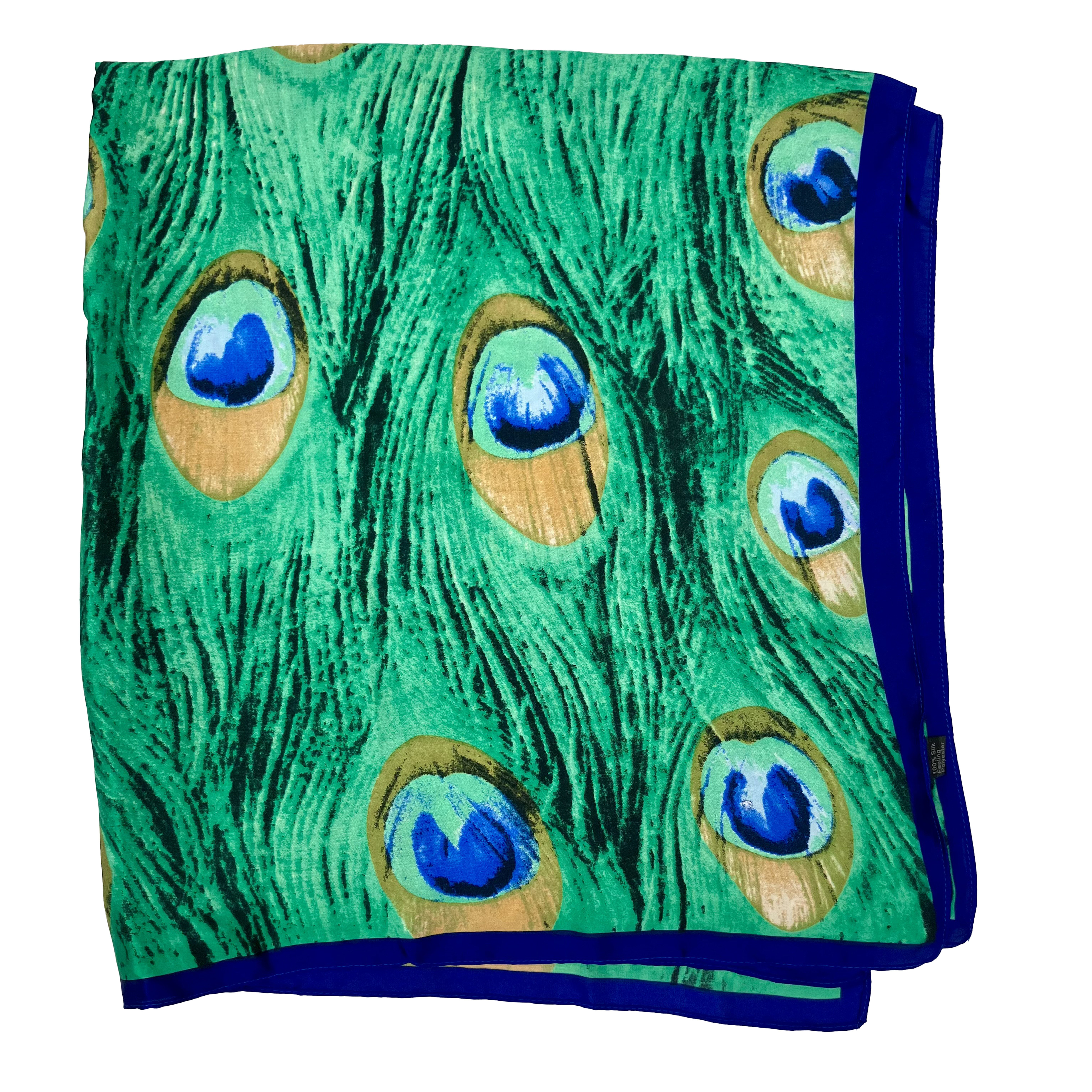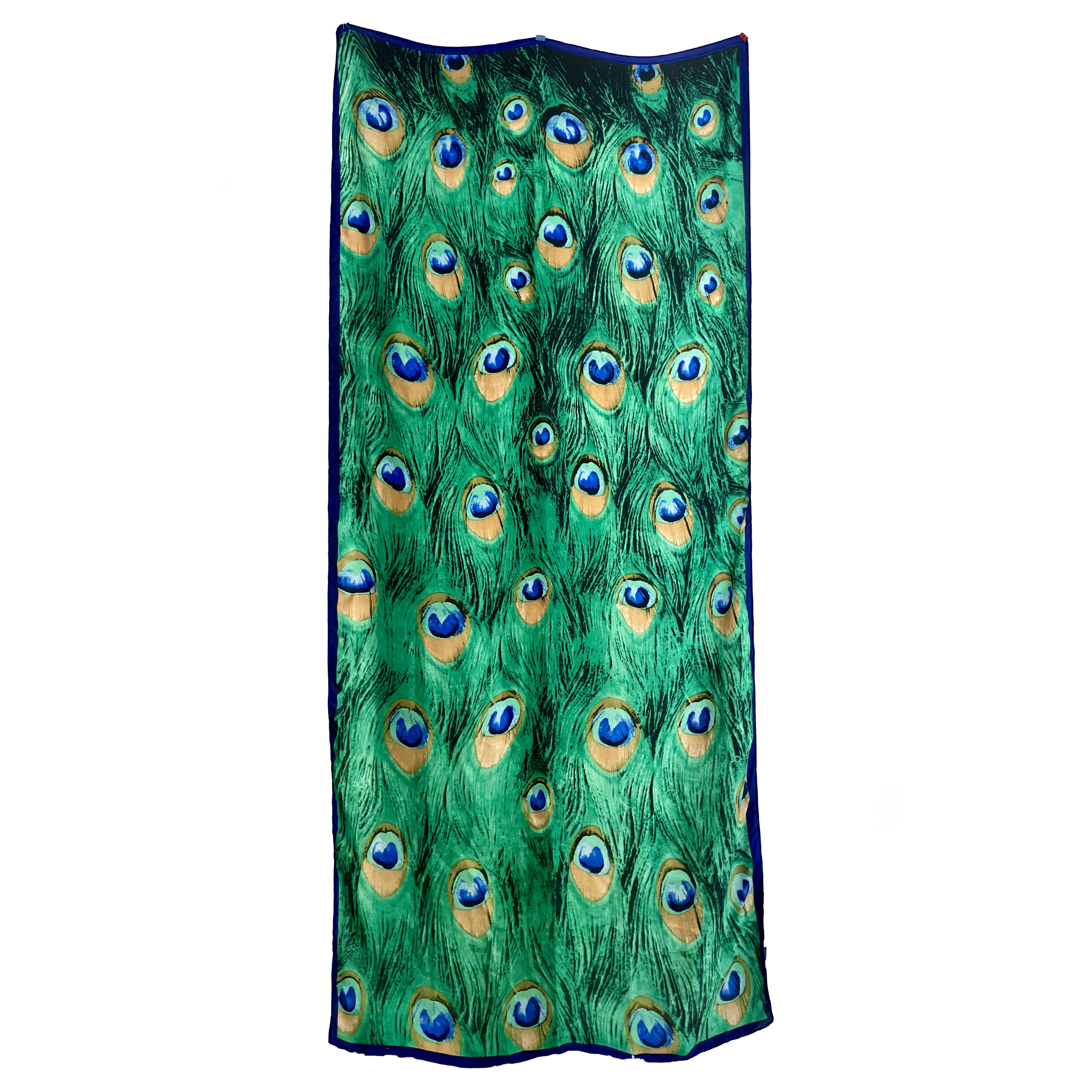 Vibrant green and blue peacock print with a royal blue border and rolled hem