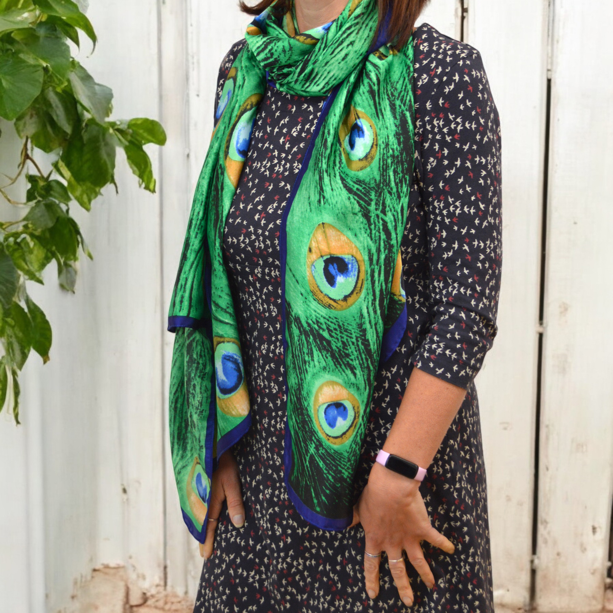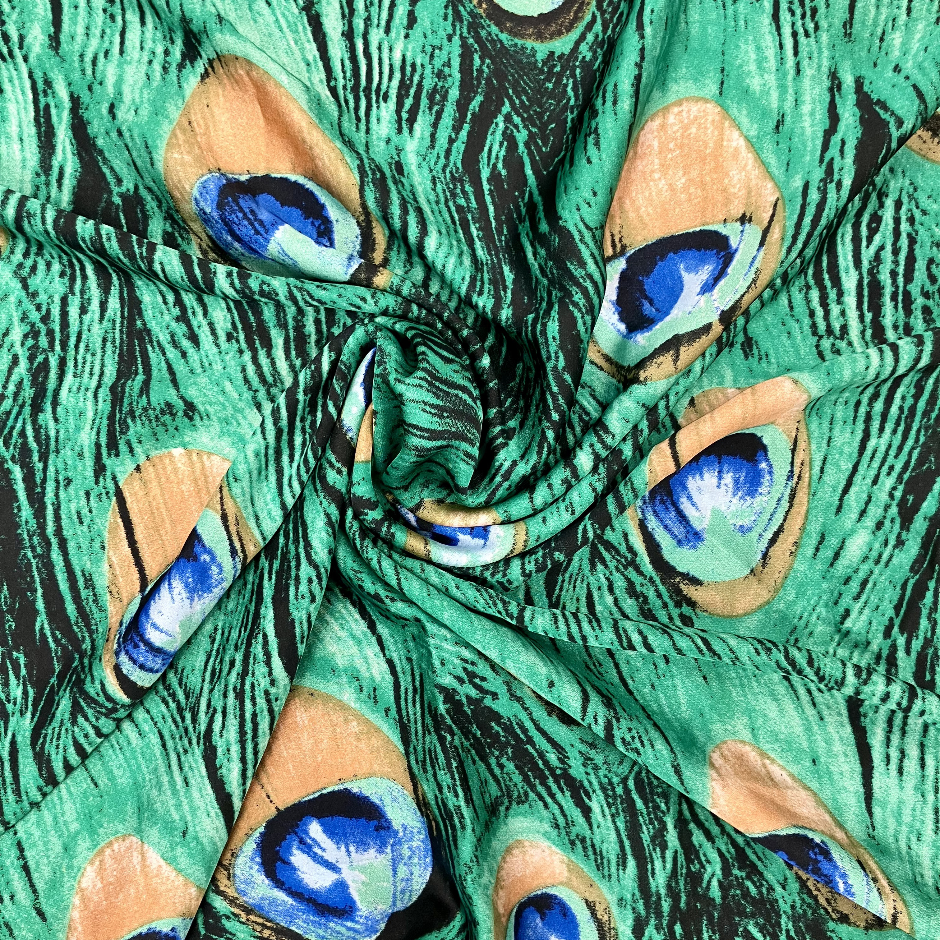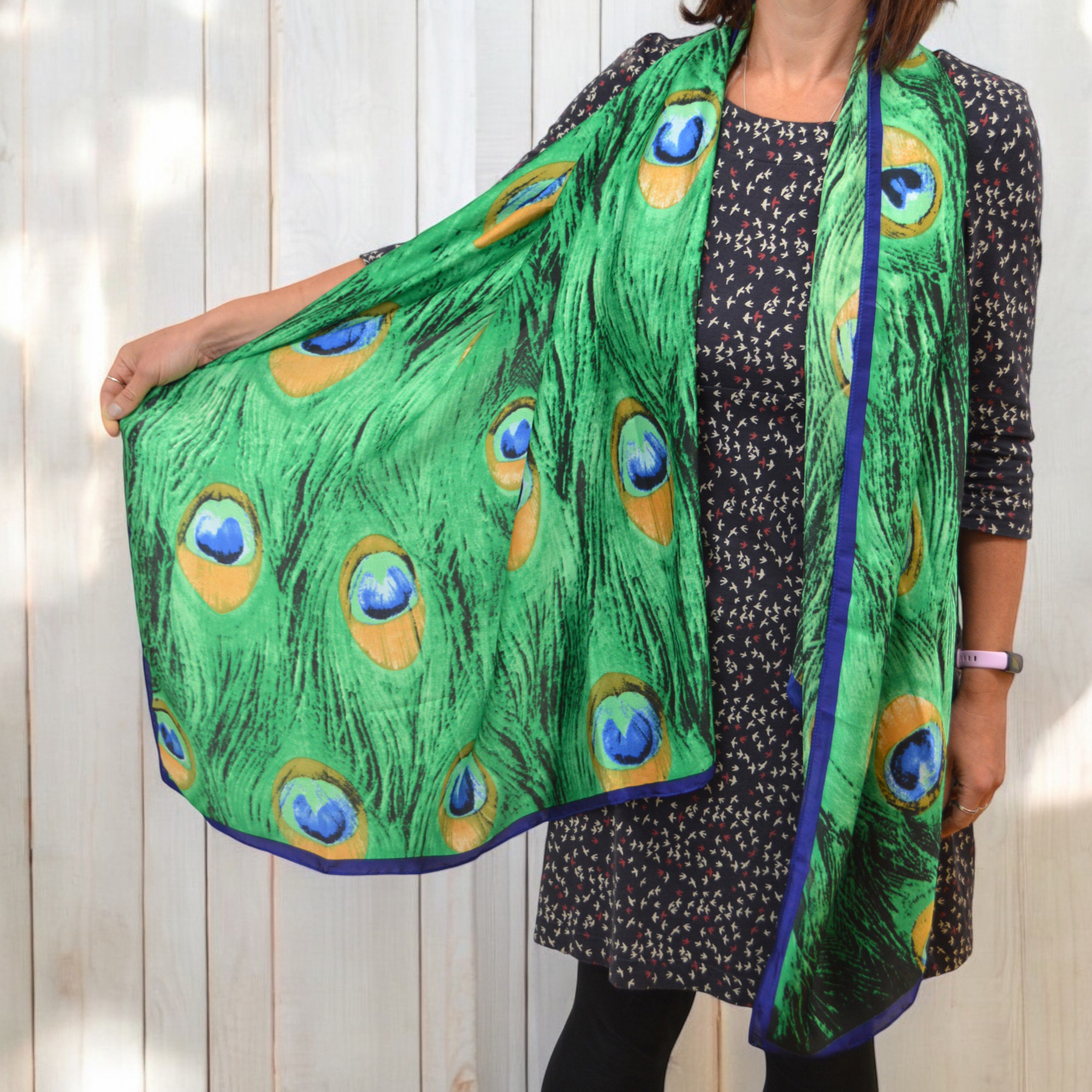 Vibrant green and blue peacock print with a royal blue border and rolled hem