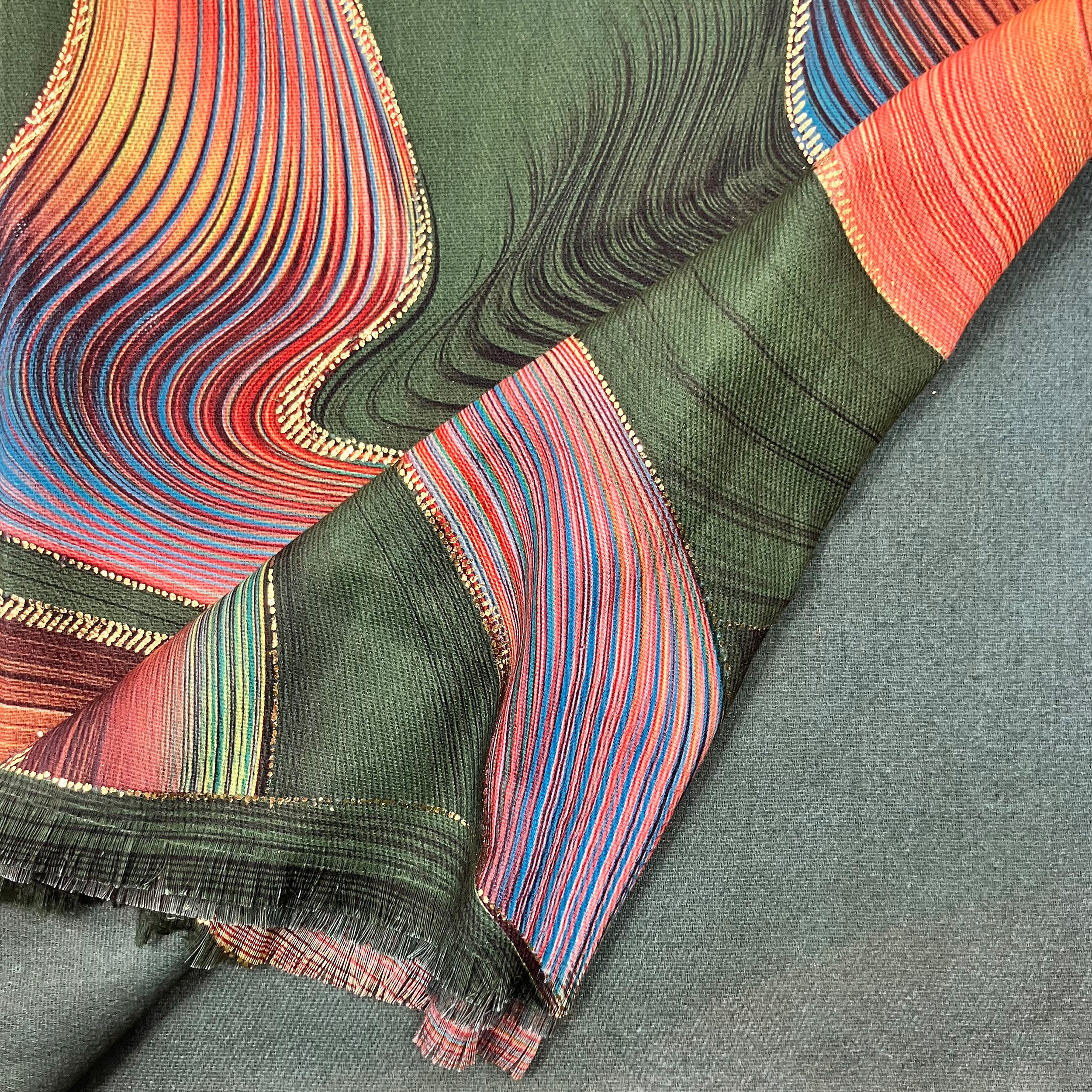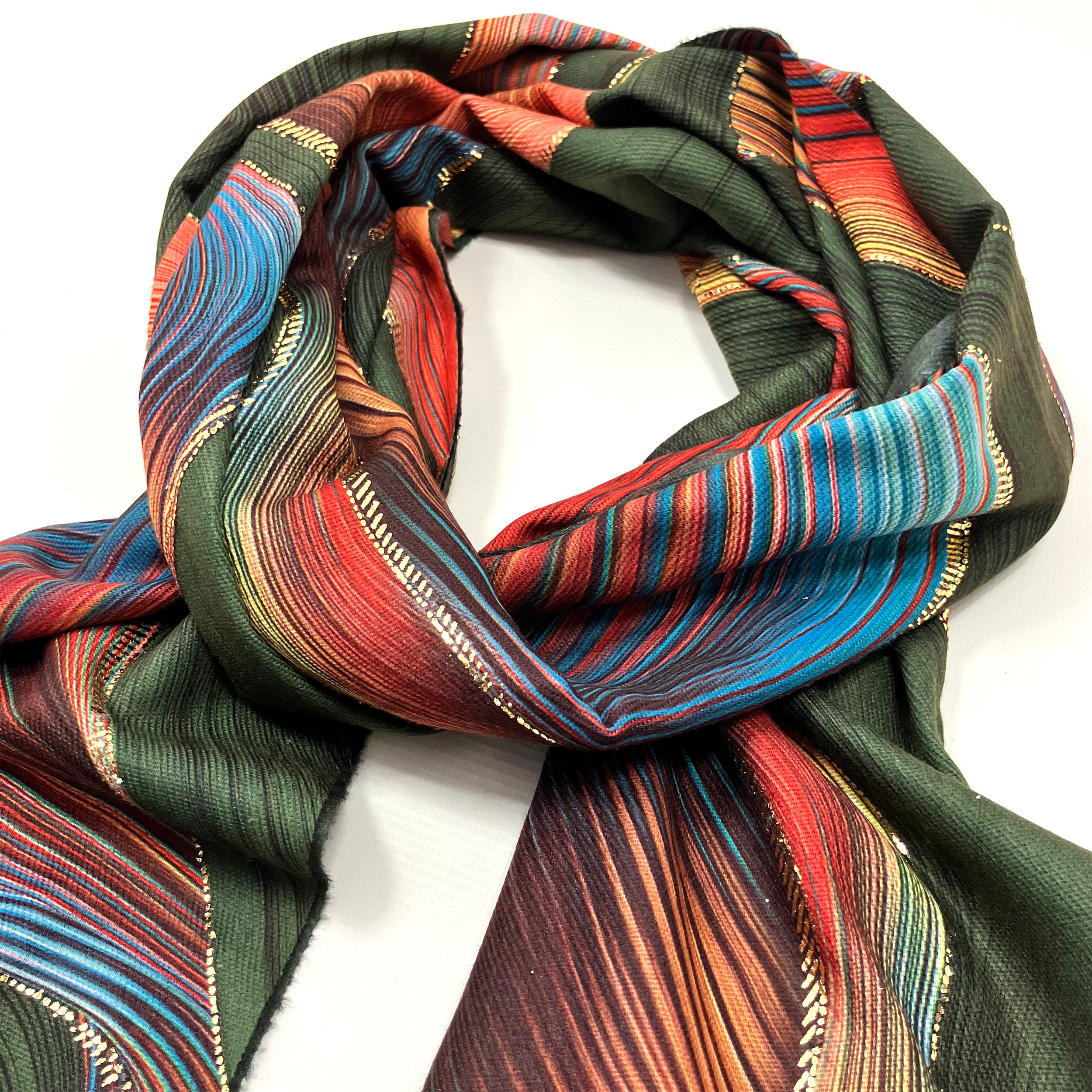 Vibrant cashmere feel swirl printed scarf with gold fleck outline with feathered ends