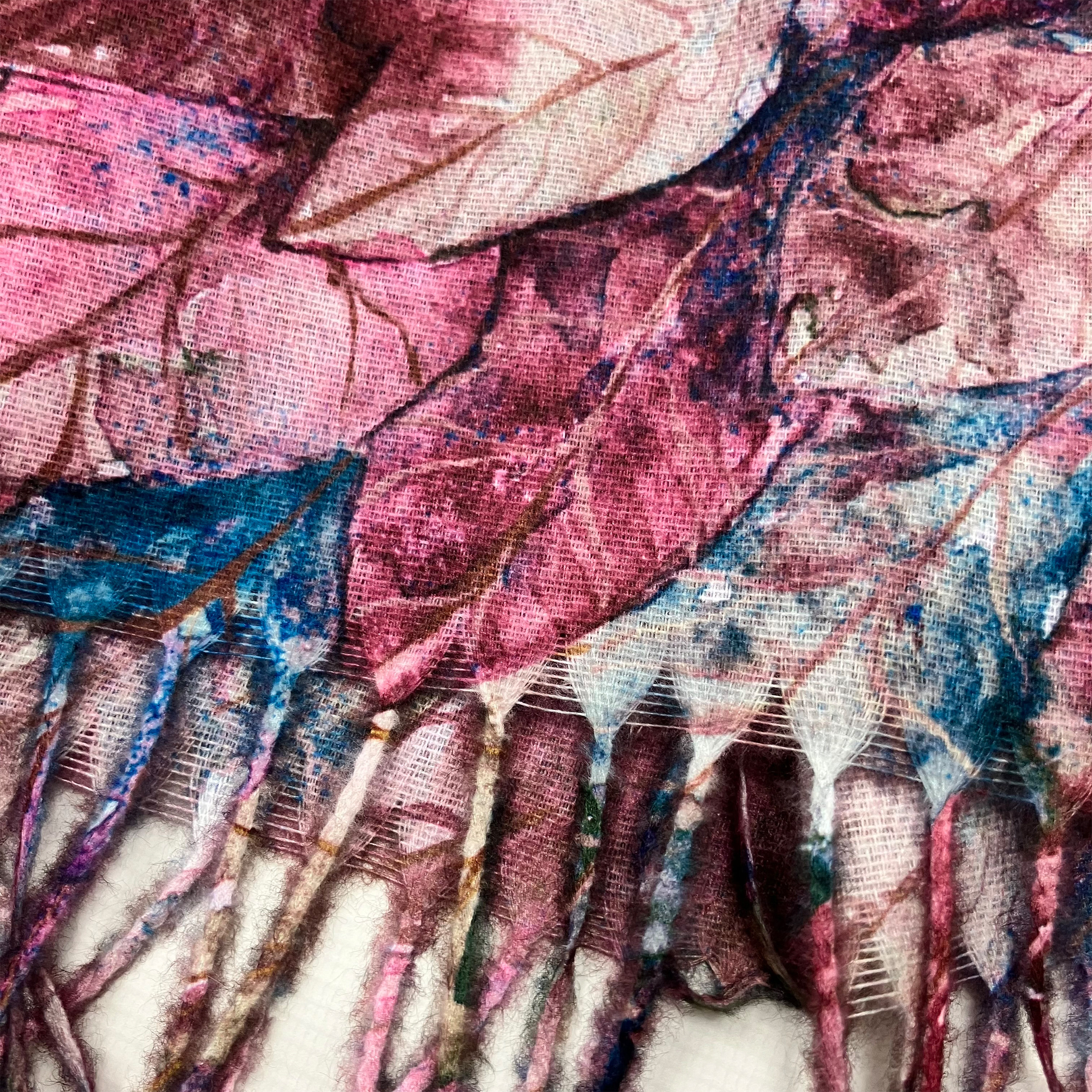 Vibrant cashmere feel leaf printed design with tassels on the ends