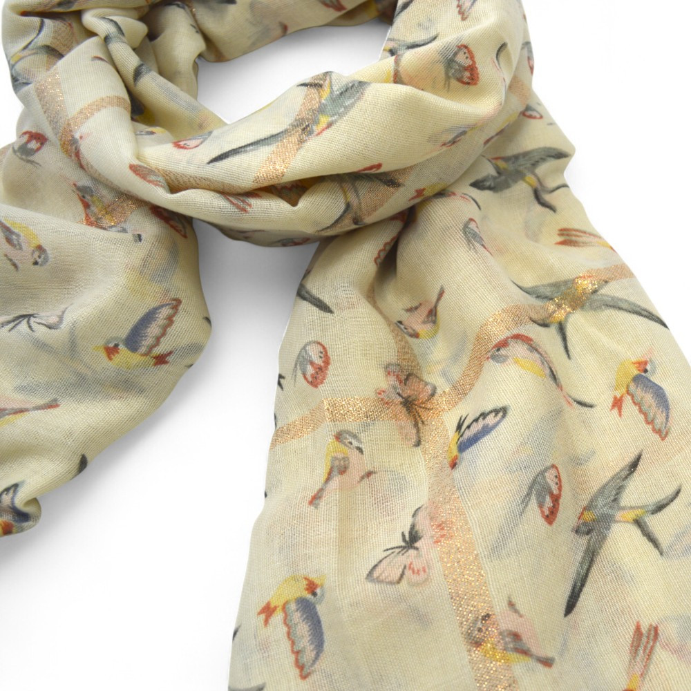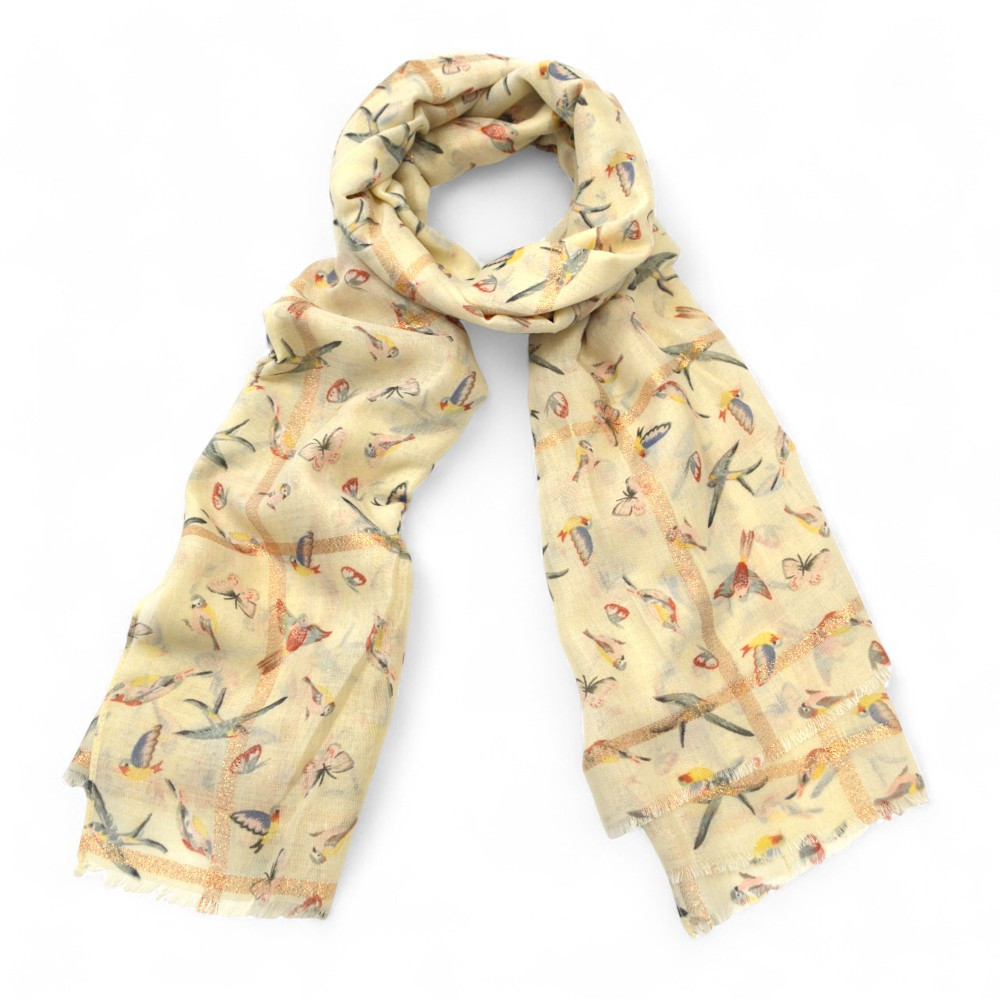 Light grey scarf with fluttering birds and butterflies.
