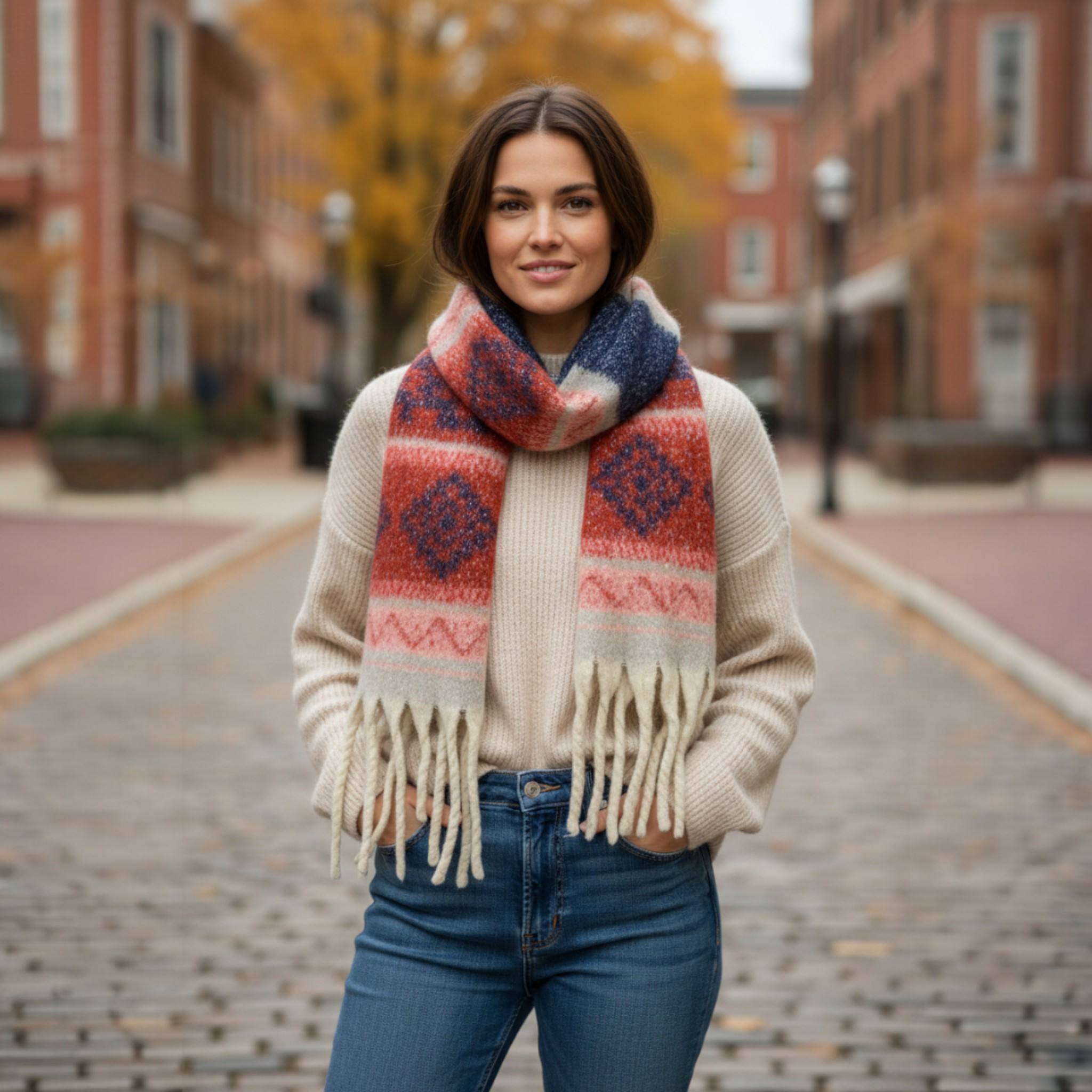 Featuring a vibrant mosaic design with tasselled ends